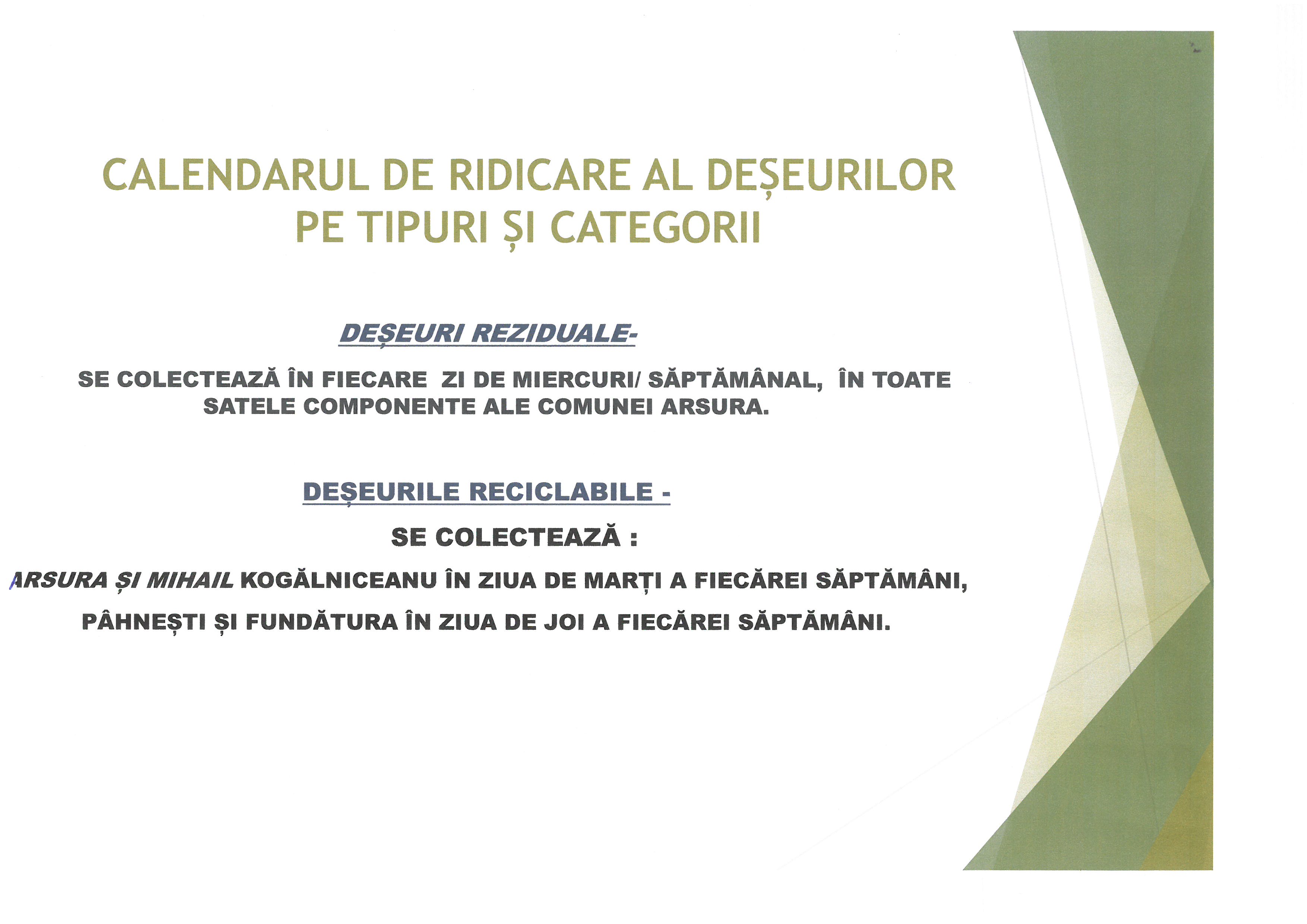 1 Calendarul de ridicare al deșeurilor pe tipuri de categorii